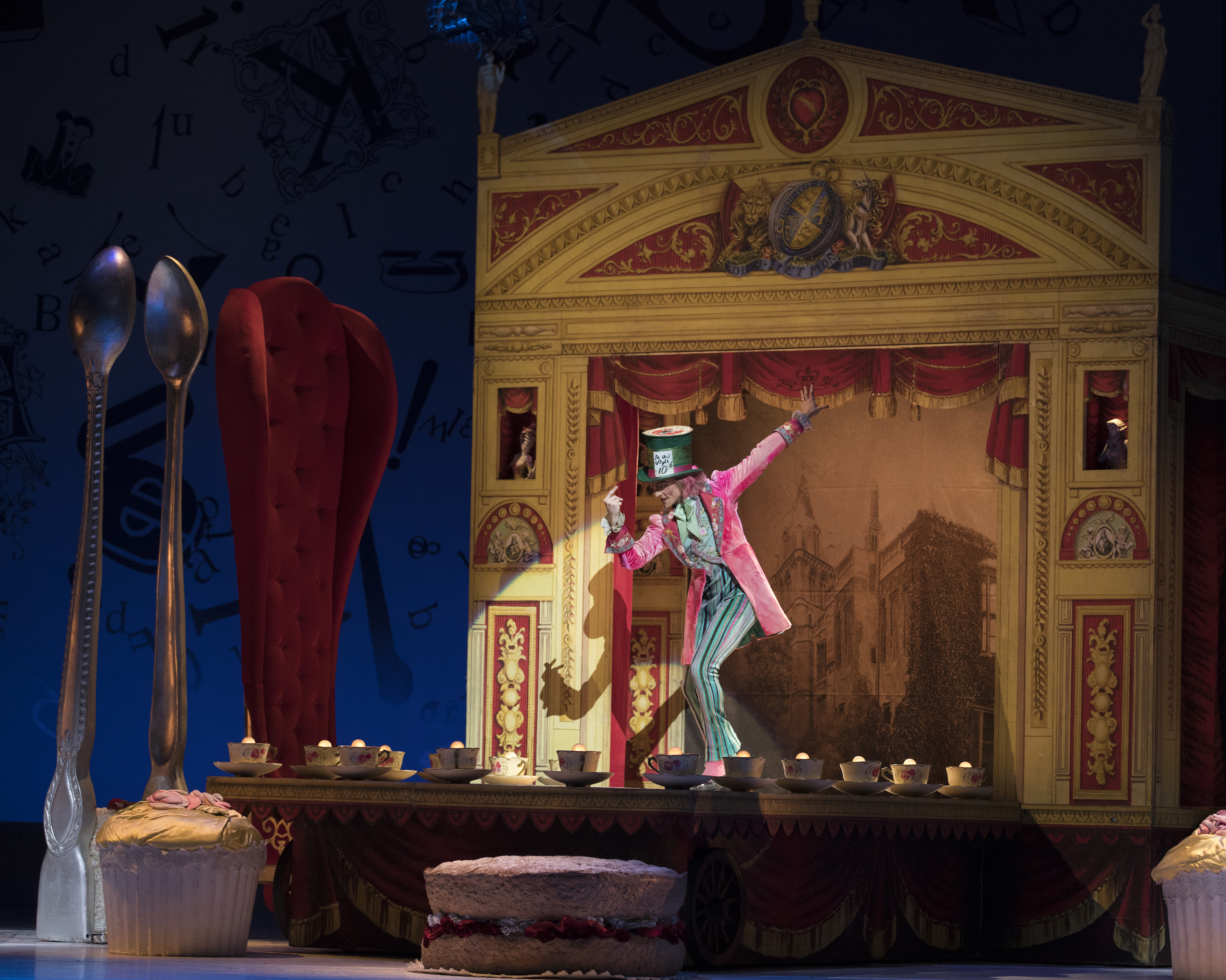 Wheeldon draws on other techniques including musical theatre and pantomime. The Mad Hatter, for example, combines tap and theatre, The Cheshire Cat is created through puppetry and The Caterpillar is created by a chorus line of dancers en pointe.