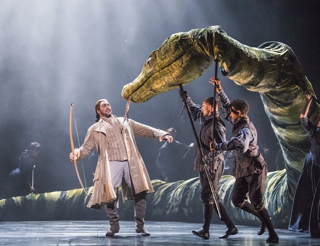 The Magic Flute begins dramatically: Prince Tamino is being pursued by a terrifying monster, from which he is rescued by three ladies in the service of the Queen of the Night. The Queen asks him to rescue her daughter, Pamina, who has been captured, and Tamino immediately falls in love with her image. With his reluctant sidekick, the bird-catcher Papageno, they embark on a brave and dangerous quest, with Tamino undergoing a series of trials in order to find true love and obtain wisdom.
