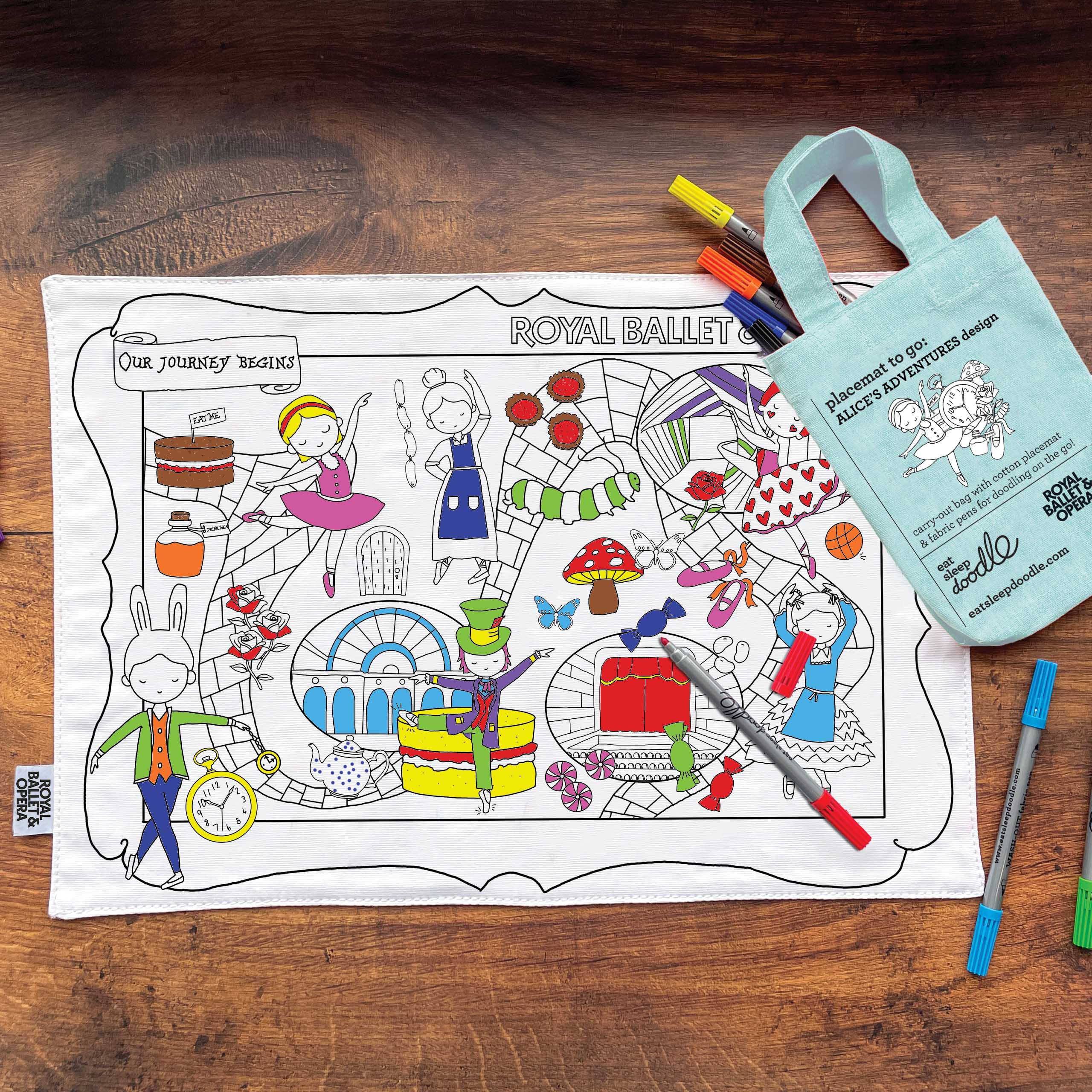 - A bespoke gift created by Eat Sleep Doodle, worth £18 and featuring scenes from Alice’s story to colour using included fabric pens. It is an imaginative activity to enjoy on site or to take home.